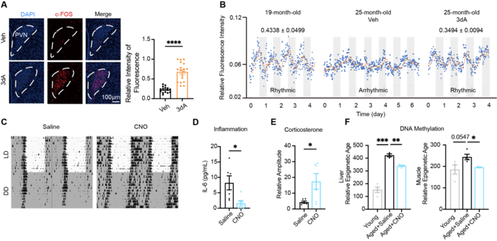 进一步地,研究团队采用化学遗传学方法在ZT10时段激活PVN神经元,以模拟3dA增强节律振幅的效应。结果显示,增强PVN神经元的昼夜节律振幅,即可改善活动与代谢节律,提升运动能力与激素释放模式,同时伴随免疫功能指标改善及表观遗传年龄下降,整体表型与3dA处理后的变化相似。该结果进一步证明,恢复PVN节律本身可能在衰老表型改善中发挥重要作用(图2)。