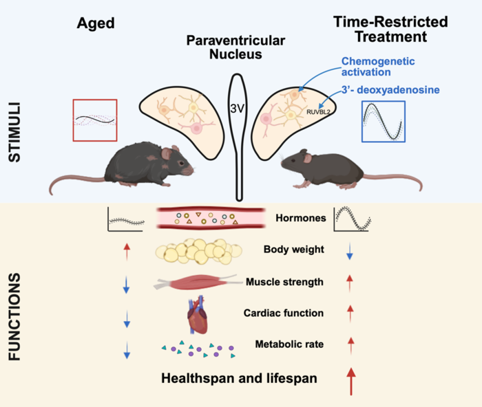 综上所述,本研究在分子、神经环路与系统生理等多个层面提供了相对连贯的机制性证据:增强PVN昼夜节律振幅可通过重塑神经内分泌节律输出, 改善多系统衰老相关表型,最终改善健康状况并延长寿命(图3)。该工作为理解PVN在健康寿命调控中的作用提供了新的实验依据,也为探索以昼夜节律振幅为潜在干预靶点的策略提供了参考,在昼夜节律、神经科学、代谢调控与衰老研究领域具有一定的理论意义与转化价值。