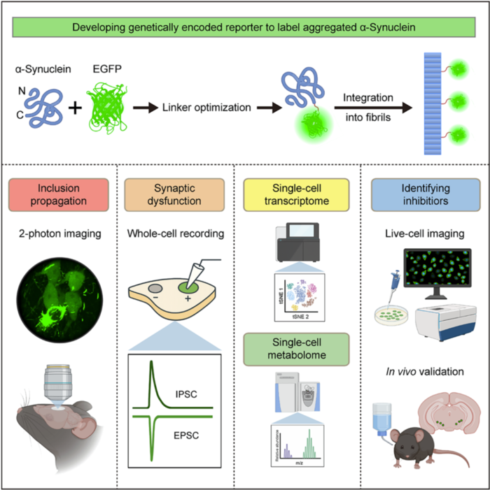 帕金森病作为全球发病率很高的神经退行性疾病,其发病的核心病理标志为 α- 突触核蛋白(α-Syn)的异常聚集,这些聚集体形成的路易小体和路易神经突会不断扩散并造成神经元损伤,成为推动疾病发展的关键因素。然而长期以来,科研领域始终缺乏能在活体大脑中精准、实时追踪 α-Syn 聚集体的技术工具,这一短板不仅让科学家难以清晰观测其动态传播轨迹,也无法深入解析其病理影响,严重制约了帕金森病发病机制研究和相关治疗手段的开发。